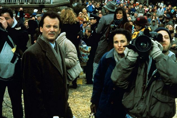 The basic construction of the movie is simple: Phil Connors (national treasure Bill Murray) is a misanthropic weather man who hates -- truly loathes beyond all reason -- the annual Ground Hog Day Celebration in Punxsutawney, PA. As you probably know, every year the groundhog, Punxsutawney Phil, will emerge from his little hollow (or, really, get yanked out a cage for the celebration) and if he sees his shadow it portends six more weeks of winter. It's dumb (as Murray's Phil points out repeatedly) but the celebration is fun and silly. Phil hates it, so after the event itself is over he flees to the news van to head home, but they get trapped in Punxsutawney by a giant blizzard.