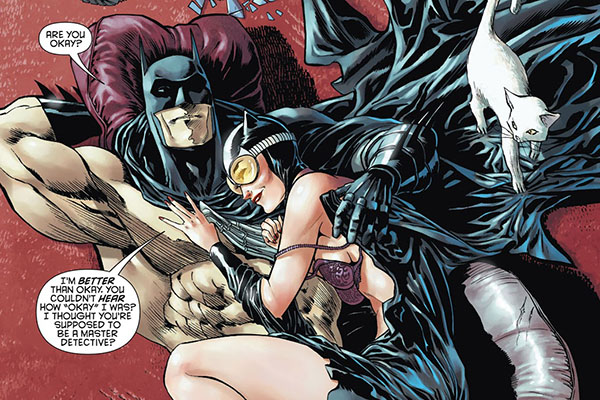 I've seen it pointed out more than once that Batman is a sexual creature -- i.e., the dude can get it, and has gotten it, frequently, in comics. DC doesn't have an issue with him having long-term sexual relationships; he's been sleeping with Catwoman, on and off, for years (and they almost got married recently which would have finally meant they were no longer "living in sin", if you actually care about that kind of thing). They've shown the couple, more than once, post coitus, clothing disheveled and mostly off, with just the right amount of covering so as not to offend "sensitive eyes." Sex itself, between two consenting adults, is fine as far as DC is concerned.
