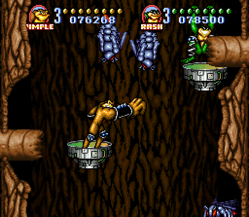 I think what lends even more credence to this idea, that the game was rushed out the door, is the fact that it's actually pretty easy. Yes, the Turbo Tunnel is obnoxious as always, but the rest of the time the game is amazingly simple to get through. There are less enemies, less traps, less challenges than then original NES game. Even the Game Boy edition felt like more work and that game was a cake walk in comparison to the NES title. Looking up the development of the NES game you'll find reports from the developers that they'd have people play the stages, watch them in action, and then purposefully go in to make them harder so that fewer and fewer people could beat the challenges. It doesn't feel like they had that kind of absuive development cycle here. At some point everyone said, "hey, there's the deadline," and tha was that.