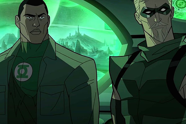 Under the guidance of the ring, Stewart flies to the JLA Citadel up in space where the soldier is confronted by the Green Arrow (Jimmi Simpson). As the previous Green Lantern of Earth, Hal Jordan (voiced eventually by Nolan North), is Arrow's best friend, the two venture off into space to find Hal and see what happened. What they find is Oa, the home planet of the Lanterns, in ruins, and more questions than answers. They end up teaming with Shayera Hol (Jamie Grey Hyder), a Thanagarian warrior who blames the Oans for an attack on her home world by the Rann forces. The three end up traveling off together to follow the clues and see what is going on with the Rann-Thanagarian war, the Green Lanterns, and how everything ties by to Hal Jordan.