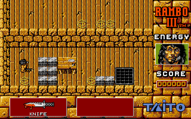 We saw a variety of ideas for Rambo games from various companies before, and looking at all of that, Ocean (with developer Taito) decided the best game to make was a top down dungeon explorer. You know, like Pack-In-Video’s various Rambo games. You start as John Rambo, in the Afghani base (skipping over the first hour or so of story in the film), equipped only with a knife (as he always was in Pack-In-Video’s titles) and he has to explore around, looking for a way to get to trautman and escape the prison.