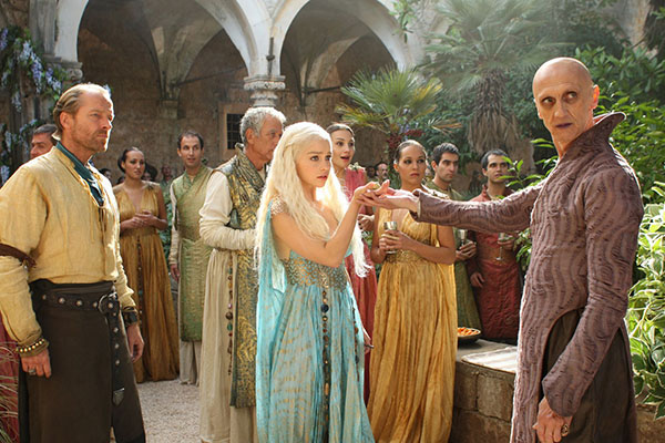 Of course, as the season evolves those are the only rulers bucking for attention. Balon Greyjoy (Patrick Malahide) rules the Iron Islands and he has a rather large grievance with the Starks in Winterfell. Proclaiming himself another king (which doesn't up our total count as at least one king dies this season), he looks to take over portions of the north and make the Starks pay. And then there's Daenerys Targaryen (Emilia Clarke), last heir of the Targaryen family, claimant to the throne of Westeros, Kahleesi of her own band of warrior riders, and the Mother of Dragons. She has her own problems over in Essos but she still plans to one day come west and lay siege to the land until she gets what's hers.