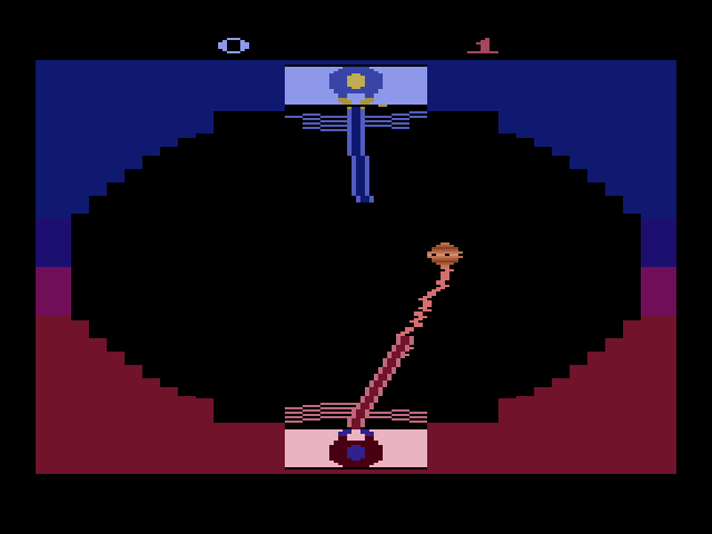 Published in 1983 (and conspicuously released only on the Atari 2600 and never ported to anything else afterwards), Star Wars: Jedi Arena is best described as a follow up to Pong or Breakout. One player sits at the end of each side of the screen, their Jedi holding their lightsabers out while a little training droid floats back and forth in the middle. The droid will, randomly, shoot out lightning at each of the *edi and the players are meant to flap around their lightsabers to block the lightning. If they fail, the lightning hits their force shields and a small part of it is destroyed.