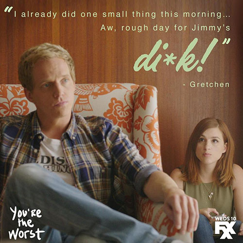 The show acts like an inversion of every other sitcom you’ve seen, giving focus to characters no one likes, casting the standard main characters as side players and extras, and then giving them plotlines that make them seem awful by comparison. I could actually see a companion show to You’re the Worst, modeled on a standard sitcom, focusing on Vernon and Becca as they go about their normal lives that you expect to see. It would be like a reverse Rosencrantz and Guildenstern, while Jimmy and Gretchen take roles more like you’d expect from them. But the magic of You’re the Worst is that it’s not the standard sitcom, that it gives you stories about awful people you don’t expect to see elsewhere, and it makes it feel more real.