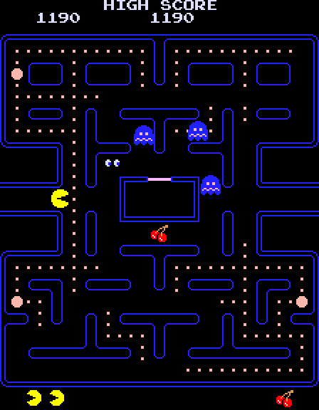 Of course, just collecting the dots isn’t all there is to the game. You also have to worry about the ghosts. These spirits protect the maze, moving around it and chasing Pac-Man to prevent him from getting the dots. If you touch one of the ghosts, you die. Lose all your lives and it’s game over. The game makes this clear from the outset, since if you let a ghost run you down, you instantly get what happens when Pac-Man disappears in a puff of pixels. Of course, if you run over one of the bigger pellets in the game (of which there are four per maze) then the ghosts turn blue and run away from you. Then you can either chase them for points, or let them run while you collect more pellets.