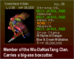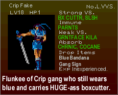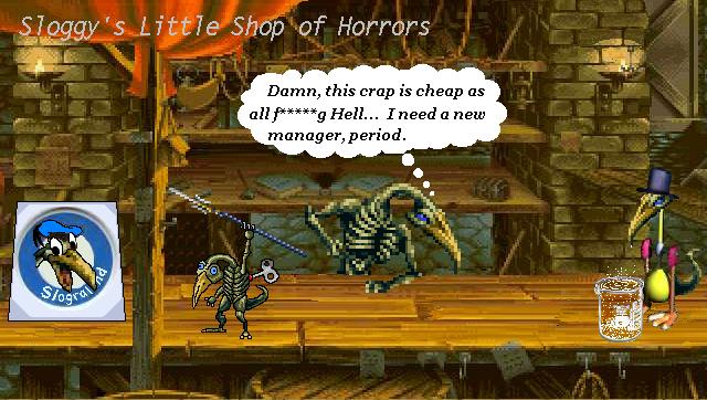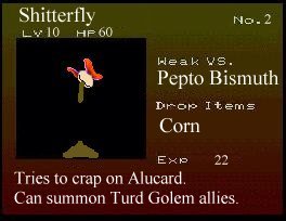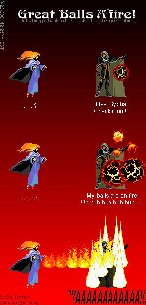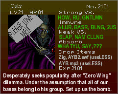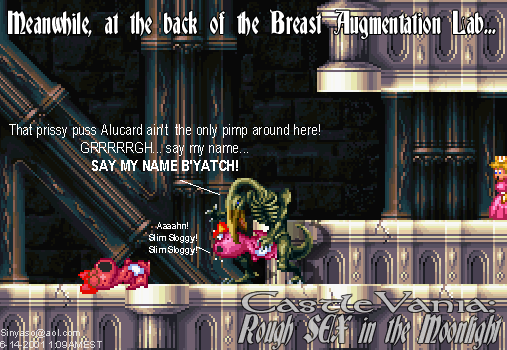 RSitM Submissions: 7/12/2001: Grrrr... I spent the last two hours uploading all the submissions and stuff, arranging it, RE-arranging it with a nice, jocular description of the pic, just to find myself doing it ONE MORE TIME after this %#@%& stupid Internet Explorer biyatch crashed... So, what did we learn from this? Well, not to write stupid, moronic comments about chit, that's what we learnt!! Sorry, I'm in a bad mood... The nice, jocular comments will be back the next time I update the site. Till then, adieu! 1 - French Maid: a cool pic, blah blah blah. By Zombie Joe. Blow me, I don't have his e-mail address. BTW, if you send me a pic but don't want me to show your e-mail address, just tell me not to do it, ok? 2 - Great Balls A'Fire: some of you already know this pic, blah blah blah, by Eric Roman. He sent me this warning .wav as well. Really neat, man; thanks! 3 - Shitterfly: it's gotta taste bitterer than your average Bitterfly... damn, I just had to include that comment. It was way too cool to ignore. Thanks, Wavid. 4 - Welcome to Aldra: a.k.a. the whore town, blah blah blah. Hey, this pic rules. Thanks, Wavid. 5 - Venus Weed Bully: it'd suck to be you, Maria. Thanks, Wavid. 6 - Breast Augmentation Laboratory: heh, this is one of my favs. AND, Birdo is a female, dammit. Thanks, Eric. 7 - Al Sucks, Richter Rules: groovy, a neat ani-gif. Blah blah blah, am I an idiot or what? I lost Evil Richter's e-mail address... But he's the author, ok?! 8 - Bonehead Ark: yay, everyone's favorite dinosaur is back! Stupid @ss... Pretty cool pic. Thanks, Eric. 9 - All your crap is belong to us: all so these pic is belong to Eric Roman, you heared me?? 10 - Grantface Killah: blah blah blah, and the Crip Fake too. Wu-Tang Clan and Castlevania? Sweet, man! Thanks, Eric. And, the ever famous Slograbilia! Okay, those were all the contributions up to this point. Man, I'm tired... Alright, go on Back to Top...