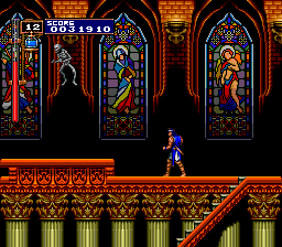 The standard sub-weapons make appearances in the game, while a new one is added to the arsenal: the holy book. When used, pages fly off the book and spiral out from the caster. Along with these sub-weapons, the "item crash" technique was added. If one has enough hearts, Richter can perform a more powerful version of whatever subweapon he has equipped (or a powereful whip-attack if he has no sub-weapon). Different subweapons create different effects, ranging from a large barrage of daggers being thrown to giant holy Crucifixes rising up from the bottom of the screen, defeating enemies. Additionally, Richter can perform a backflip move, althoughs it's seldom used and not really essential to the game. Thankfully, as with Simon in Super Castlevania IV, Richter can jump on and off of stairs (and even back-flip off). As far as controls, this game is no step back for the series.