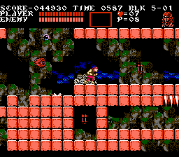 Grant DaNasty, a very fast and nimble character who can scale walls and has the great benefit of Controlled Jumps, for those who hated the Belmont tendency to jump in one direction (without mid-air changes) and classic "drops like a rock" gravity. Grant can move freely while jumping and stick to a walls by just pressing towards where the wall is and jumping at it (while holding down on the direction to actually "stick"). You can traverse ceilings and platforms this way, and can avoid some nasty areas at times just by having this character in your party. Consequently, there are blocks in the game that crumble when a character steps on them, but if Grant is hanging from their bottom or from their side, they will not crumble. The only drawbacks to Grant is that sometimes he's a little too easy to control and you might hit a Spiked Ceiling because of his high jump. He's also easier to damage than Trevor, taking an extra point of damage for each hit.