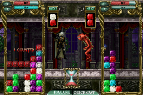 The trick of it is that instead of your usual Castlevania action -- running and jumping and attacking monsters with your swords -- your battles take place in a puzzle arena. This is where the "Puzzle" part of the title comes in as each room of Dracula's castle requires Alucard to fight a monster, be it zombies or armors or anything else you're used to. The battle is a one-on-one, Puyo Pop-style match with the opponents (you and the monster you're fighting) dropping pairs of colored blocks down the usual puzzle shaft so they can be matched up in combos. Connect three or more of the same color and they'll explode, droppthe other blocks down further, allowing for even more explosions.